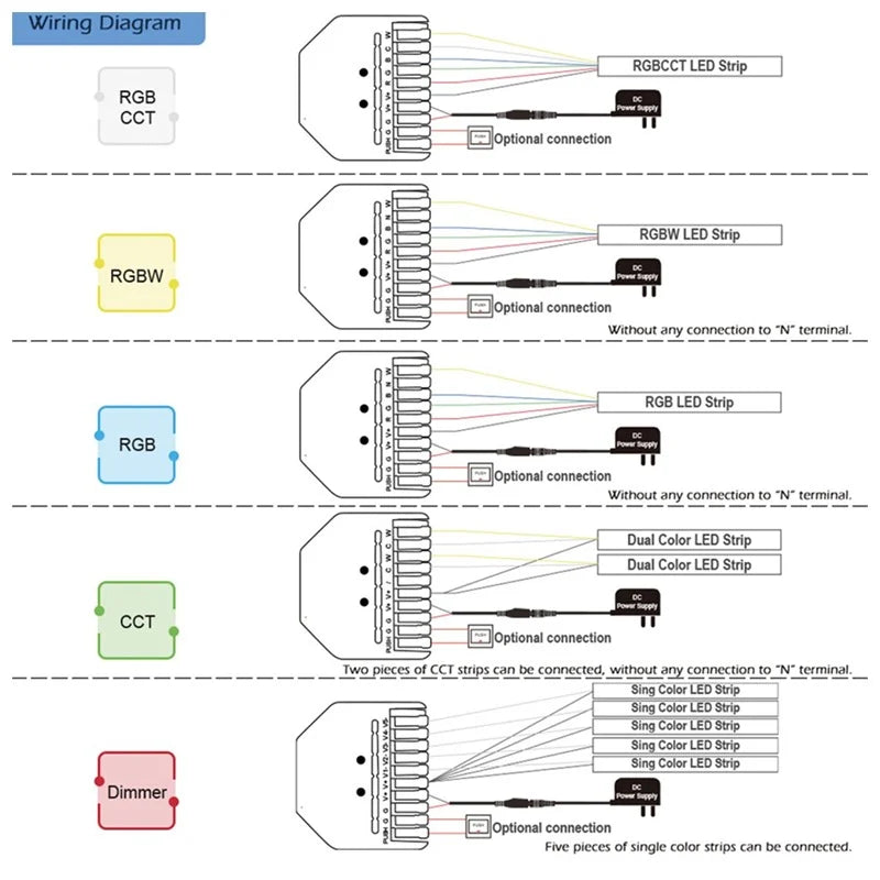 - 5 in 1 Single color, CCT, RGB, RGBW, RGBCCT lighting